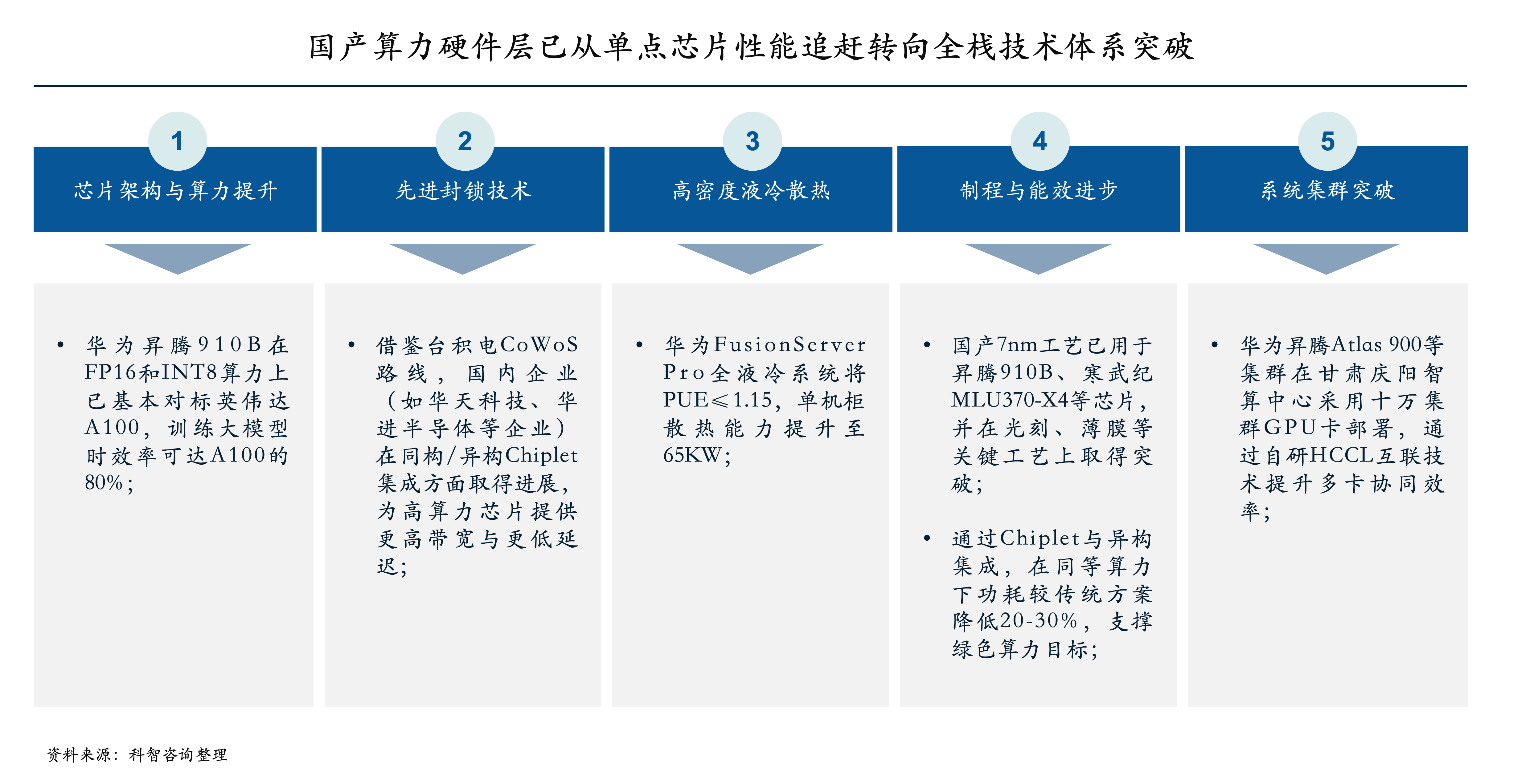 在技术层面,国产算力已从单点芯片性能追赶,转向全栈技术体系的系统突破。华为昇腾910B在FP16与INT8算力上已基本对标英伟达A100,训练大模型效率可达其80%。在封装技术方面,华天科技、华进半导体等企业在Chiplet异构集成方面取得进展,为高算力芯片提供更高带宽与更低延迟。液冷散热方面,华为FusionServer Pro全液冷系统将PUE降至1.15以下,单机柜散热能力达65KW,支撑绿色算力目标。制程方面,国产7nm工艺已应用于昇腾910B、寒武纪MLU370-X4等芯片。系统集群方面,华为Atlas 900已在甘肃庆阳实现十万卡集群部署,自研HCCL互联技术提升多卡协同效率。