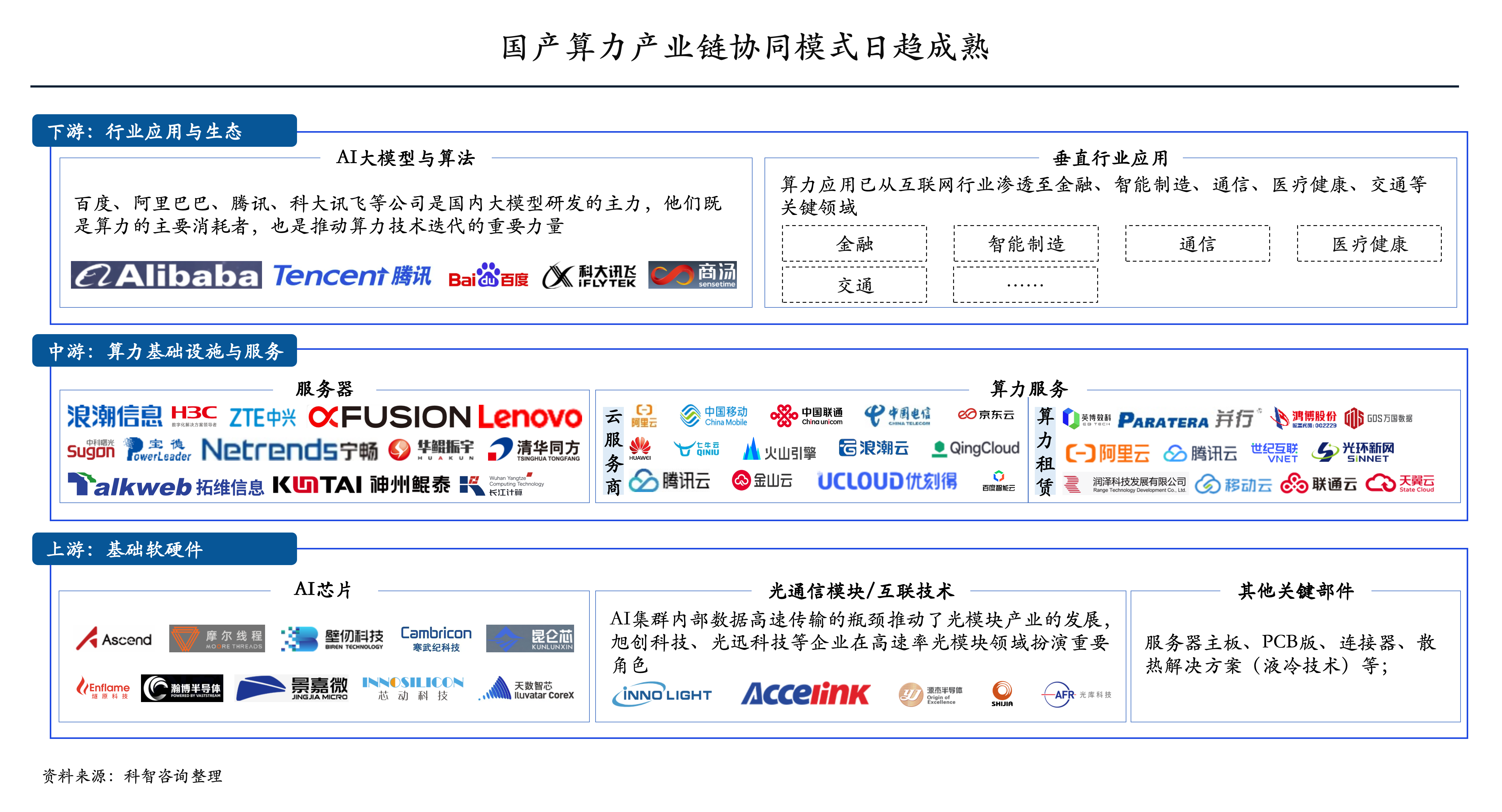 国产算力产业链协同模式日趋成熟。一方面,以华为、海光为代表的生态联盟模式,通过开放平台吸引服务器厂商、算力服务商、软件商共同构建生态;另一方面,企业间深度绑定成为趋势,如海光与中科曙光、青云科技的合作,实现从芯片到云服务的垂直整合。此外,国产算力与能源协同创新也逐步推进,“绿电直供”模式助力算力中心实现绿色低碳发展。